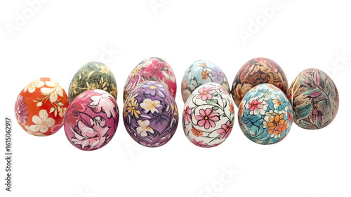 • A set of colorful Easter eggs decorated with floral patterns, isolated on white background in HD