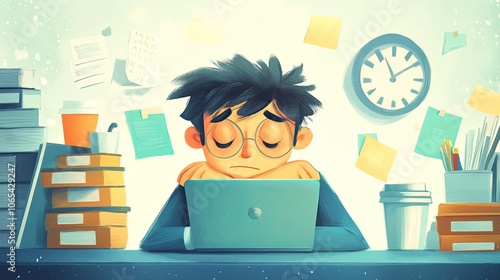 a sleepy office worker surrounded by empty coffee cups, stacks of files, and a laptop. The character has droopy eyes, highlighting the need for caffeine