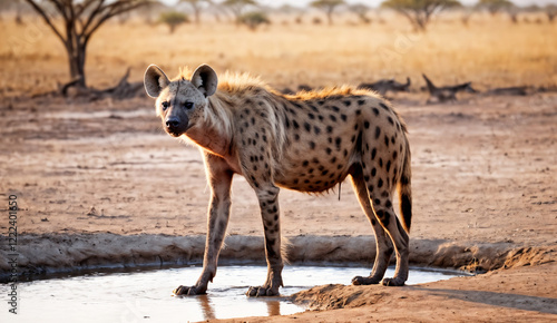 hyena, savanna, waterhole, scavenger, wildlife, nature, ecosystem, predator, balance, african wildlife, conservation, habitat, drinking water, wilderness, survival, flora and fauna, dusk, biodiversity, prey, scavenging, territory, landscape, arid, species, wild, environment, earth, journey, solitary, drought, fauna, observing, twilight