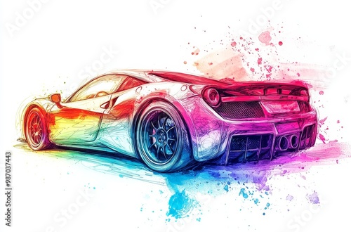 A sports car depicted with a rainbow paint splatter pattern on its side