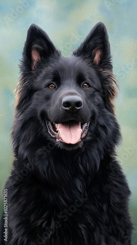 A tight shot of a black dog's expressive face against a green backdrop, framed by a blue sky in the distant background