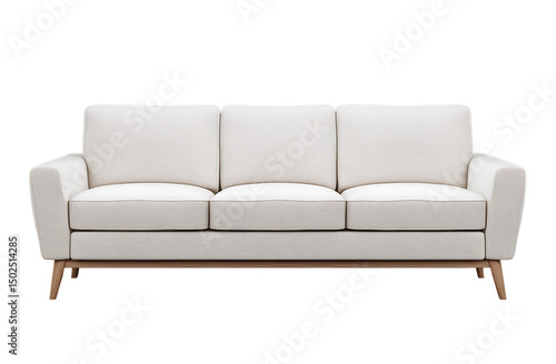 A white sofa with wooden legs, featuring soft fabric and three seats. The front view is captured in high-definition