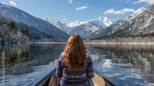 A woman sits on a boat amidst a tranquil lake, with towering mountains and snow-capped peaks visible in the distance