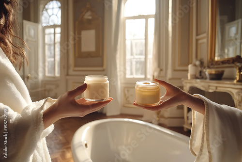 A woman wrapped in a towel stands in a bathroom, holding a jar of face cream in her hand as she applies it to her skin. The scene suggests a skincare routine