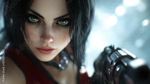 A women with green eyes gazes intently into the camera, gun clutched tightly in hand Her expression is serious