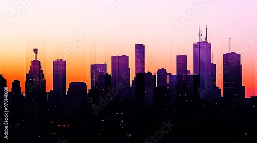 Abstract city skyline at sunset, featuring a stunning blend of warm oranges and purples that capture the urban landscape at its most enchanting hour.