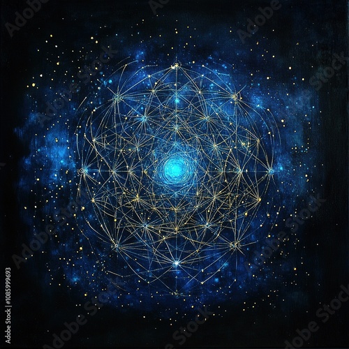 Abstract cosmic design with blue geometric lines and stars.