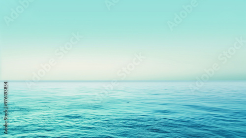 Abstract watercolor seascape with expanses of green and blue water shrouded in mist and haze.The blue sky creates a calm and serene atmosphere.