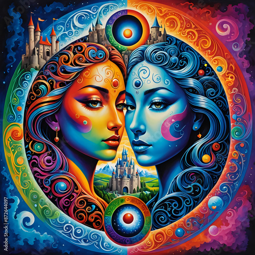 Abstraktion Farbige Fantasie mit Gesichtern 1x1. Hintergrund für das Design 1.