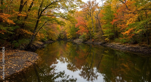 やわらかな自然光が降り注ぎ秋色に染まる豊かな森と穏やかな川水面に映る色とりどりの紅葉が鮮やかに輝き息をのむような美しい風景を創り出す. AI Generated