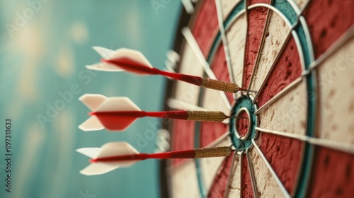 ** aiming for success. ** Three red and white darts hit the bullseye of a classic dartboard, symbolizing achievement, precision, and reaching your goals.