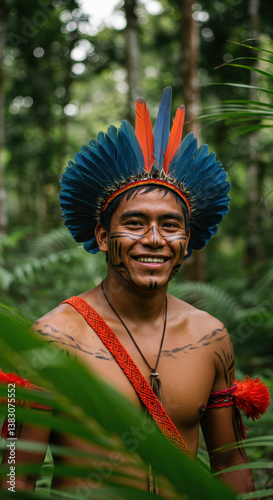 Amazonian Smile: Indigenous Man Portrait with Traditional Headdress & Body Paint in Lush Rainforest - Culture, People, Nature