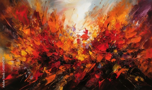 an abstract painting of red and yellow flowers on a black background. generative ai