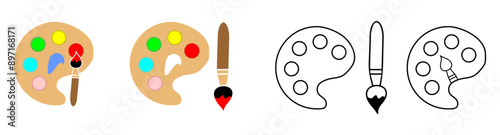 paint, icon, brush, art, pallet, pallette, vector, painter, paintbrush, colours, artist, line, draw, tool, outline, colours, flat, illustration, gouache, oil, equipment, watercolor, symbol, graphic, water, wooden, pattern, design, wood, concept, education, creative, drawing, colourful, acrylic, dye, artistic, palette, gallery, object