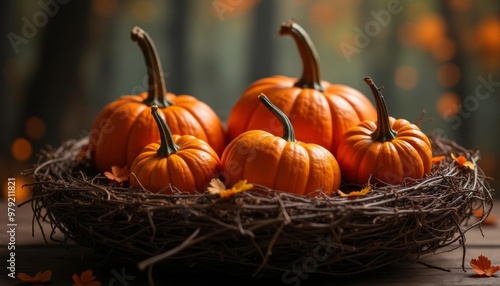 nest, organic, still life, cosy, pumpkin, seasonal, orange, fall, autumn, basket, warm, rustic, decoration, harvest, natural, gourd, home decor