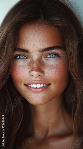 beautiful college girl, tan skin, blue green eyes, brunette hair, portrait, beautiful smile