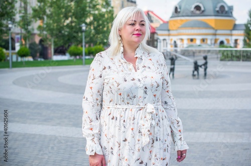 Beautiful woman on a walk in the city. Spring - summer time. A nice middle aged plus size woman at the street. Citizen lifestyle