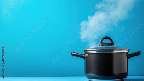 Black Cooking Pot with Steam on Blue Background in Modern Kitchen. Culinary Scene with Warmth and Style.