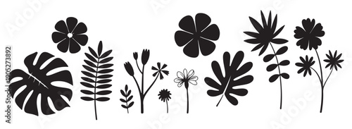 black silhouette botanical collection various flowers leaves