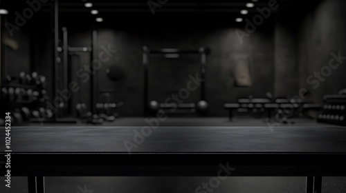 Black table top with gym background for product. Empty countertop mockup for sports nutrition or equipment.