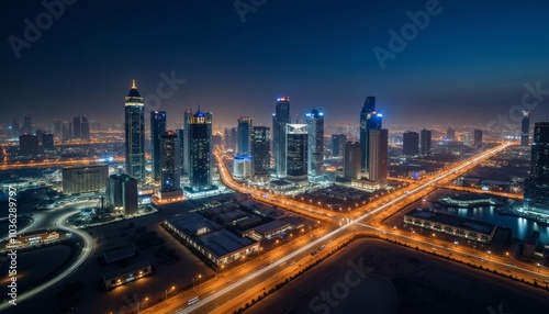 light, road, development, architecture, skyscraper, metropolitan, city, modern, transportation, night, aerial, traffic, urbanisation, skyline, highway, urban, city landscape, building, infrastructure, dusk, illuminated