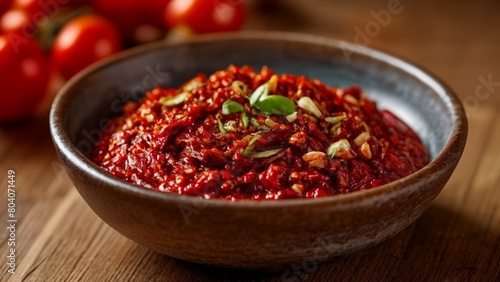 Cherry tomatoes and herbs garnish a vibrant red sauce in a bowl