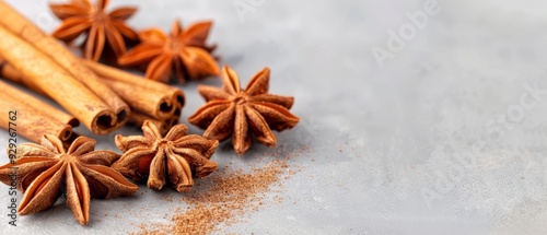 Cinnamon sticks, star anise, and cinnamon powder lie on a pristine white surface A few cinnamon sticks protrude from the pile