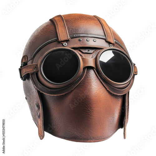 helmet, airman, vintage, pilot, leather, retro, flight, old, historic, antique, aviation, adventure, brown, headwear, protection, accessory, classic, style, equipment, air, travel, transportation, uniform, fashion, object, studio, view, front, aged, worn, texture, craftsmanship, design, eye, gear, strap, buckle, round, metal, glasses, sky, journey, exploration, earth, era