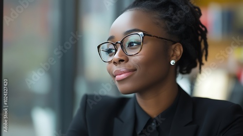 Close-up photo of a young African-American woman in a business suit and glasses in the office, looking to the side with a smile