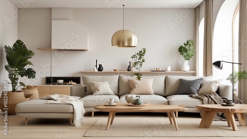 : Contemporary living room in Scandinavian design, highlighting simplicity, natural materials, and an uncluttered, harmonious space.-