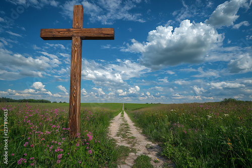 cross, countryside, road, wildflower, grass, fisheye, sky, religion, jesus christ, blue, symbol, god, faith, church, crucifix, religious, catholic, easter, cloud, wooden, landscape, cloud, silhouette, light, wood, white, spiritual, bible, heaven