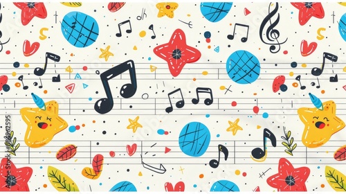 Cute cartoon music pattern, with colorful icons of instruments and notes scattered, lined in a white grid, reminiscent of sheet music
