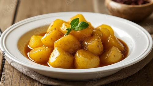 bowl, dessert, tablecloth, presentation, tableware, dining, cookery, culinary, apple, food, cooking, fruit, sauce, wooden table, garnish, kitchen, dish, sweet, caramel