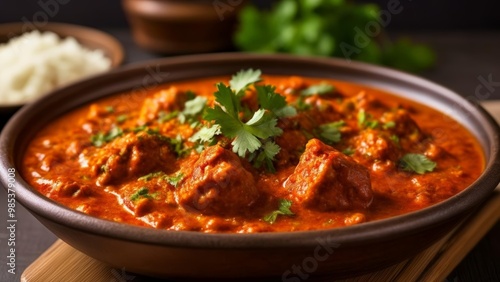 bowl, colourful, dining, accessing, spicey, flavorful, curry, garnished, ethnic, hearty, appetising, cilantro, meal, food, wooden table, eatery, meat, aromatic, savoury, rich