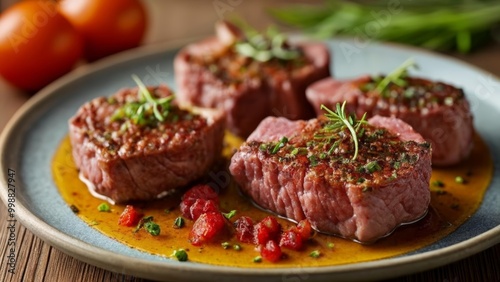 presentation, dining, accessing, culinary, tomatoes, meal, food, herb, cooking, table, steak, sauce, garnish, eatery, meat, beef, savoury, plate, epicure