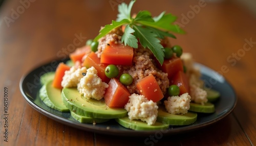 presentation, dining, meal, food, dish, plate, vegetarian, salad, alimentary, garnish, colourful, healthy, table, tomatoes, avocado, vegetable, cucumber, chickpea, fresh