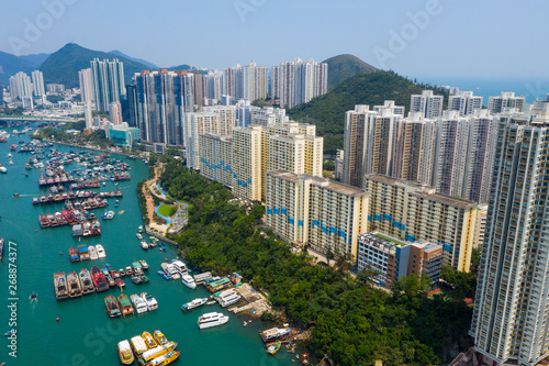 Drone fly over Hong Kong city with typhoon shelter