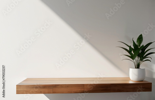 Empty minimal natural wooden table counter podium, beautiful wood grain in sunlight, shadow on white wall for luxury cosmetic, skincare, beauty treatment, decoration product display background