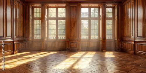 empty room with dark wood paneling and window, Luxury wood paneling background or texture. highly crafted classic or traditional wood paneling, with a frame pattern