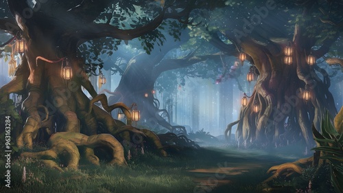 Enchanting Fantasy Forest with Lanterns and Mist