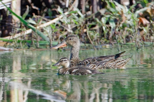 Female northern shoveler and its duckling.