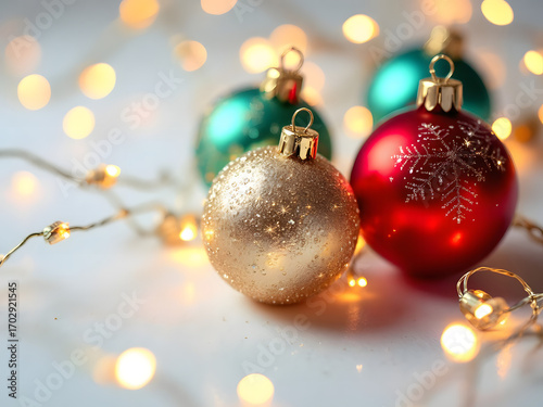 festive christmas ornaments and bokeh lights, creating a warm and magical holiday atmosphere