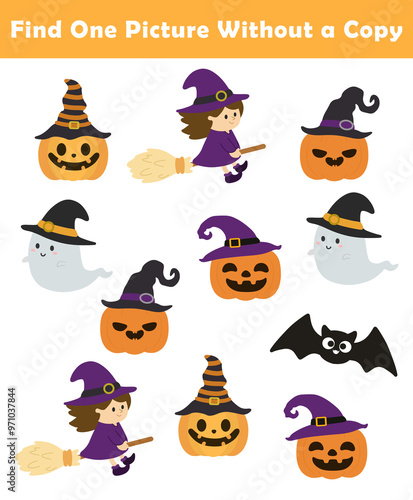 Find One Picture Without a Copy for Preschool Children. Find same picture worksheet for kids. Worksheet for kindergarten-aged children with cute halloween illustration.