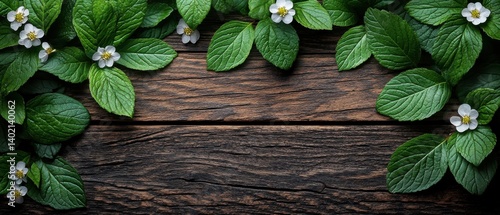 Fresh Green Mint Leaves and White Blossoms Frame on Rustic Wooden Background for Spring Design