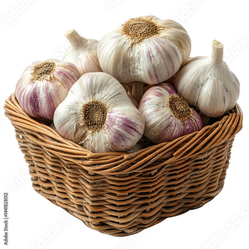 garlic, basket, isolated, transparent, background, food, vegetable, white, spice, ingredient, healthy, fresh, bulb, organic, cooking, onion, market, raw, agriculture, herb, closeup, clove, nourishment, natural, seasoning, diet, health