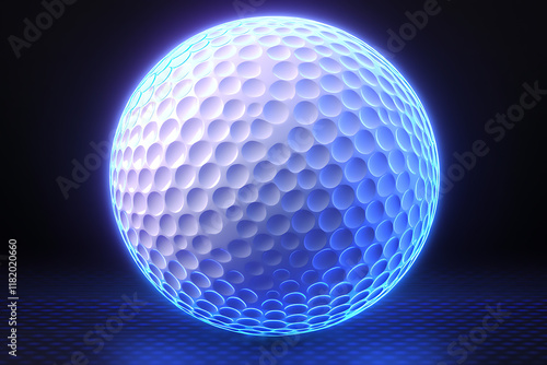 Glowing wireframe a white golf ball with a dimpled surface on a transparent background, highlighted by a combination of blue and black data points