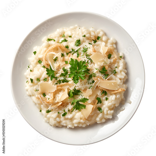 Gourmet flat-lay of risotto plate with parmesan curls and parsley flakes, isolated on transparent background