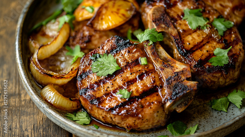 grilled pork chops with caramelized onions and cilantro bbq food meat meal herb tasty brown