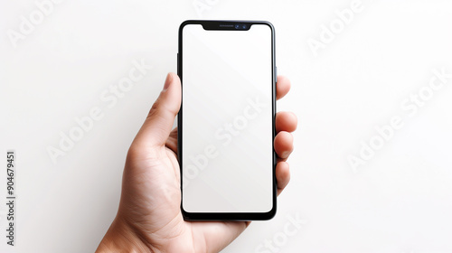 Hand holding black smartphone with mockup of blank screen on white background