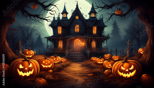 Haunted House with Halloween Pumpkins- A spooky scene featuring pumpkins in front of a haun_1(181)